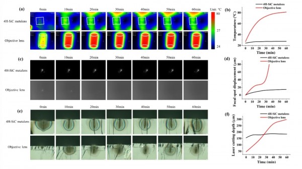 為(wei) 了模擬激光加工中嚴(yan) 苛的高功率連續加工條件,在熱漂移測試中采用了與(yu) 光學測試相同的光路,但光源替換為(wei) 15 W 1030 nm 激光器。分別測試了 4H-SiC 超透鏡和商用物鏡在連續工作 1 小時內(nei) 的器件溫度、焦平麵和切割效果的變化。通過紅外熱成像儀(yi) 測得的器件表麵溫度變化如圖4a-b 所示。在高功率激光照射 60 分鍾後,4H-SiC 超透鏡的器件溫度僅(jin) 上升了 3.2℃,溫度變化僅(jin) 為(wei) 物鏡(升溫 54.0℃)的 6%。與(yu) 傳(chuan) 統物鏡相比,4H-SiC 超透鏡在沒有附加冷卻組件的情況下,運行約 10 分鍾後即可達到穩定溫度,且溫度變化較小、工作溫度更低。這種卓越的熱管理性能展現了 4H-SiC 超透鏡在苛刻工況下的有效性。