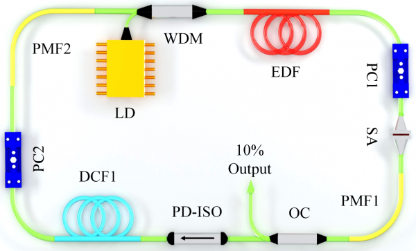 采用的雙被動混合摻鉺鎖模光纖激光器由半導體(ti) 激光器(泵浦源)、摻雜光纖(增益介質)、波分複用器、隔離器、輸出耦合器組成的環形腔(諧振腔)等組成,如圖1所示。可飽和吸收體(ti) 和非線性偏振旋轉的混合鎖模方式極大地提高了激光器產(chan) 生鎖模脈衝(chong) 的可調諧範圍,並保證了鎖模穩定性,為(wei) 實驗中發現類束縛態調Q鎖模脈衝(chong) 提供了可靠的技術平台。