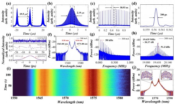 圖2 類束縛態調Q鎖模脈衝(chong) 狀態:(a)-(c)典型的類束縛態調Q鎖模脈衝(chong) 序列和(d)單個(ge) 類束縛態調Q鎖模脈衝(chong) ,(e)未濾波的自相關(guan) 軌跡、小波降噪自相關(guan) 軌跡和引入濾波的自相關(guan) 軌跡,(f)光譜,(g)射頻頻譜(掃描範圍:1.000 MHz;分辨率帶寬:1 Hz),(h)以鎖模基頻為(wei) 中心的射頻頻譜(掃描範圍:1.600 MHz;分辨率帶寬:1 Hz),(i)1s間隔的光譜,(j)第72 s和 73 s的光學光譜