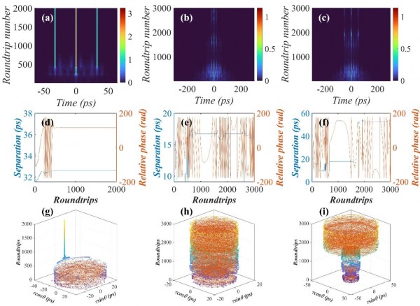 圖3 束縛態孤子和類束縛態調Q鎖模在往返過程中的自相關(guan) 軌跡和演化過程:(a)-(c)自相關(guan) 軌跡,(d)-(f)脈衝(chong) 間距和相位差隨傳(chuan) 輸圈數的演化,(g)-(i)相應的三維交互圖