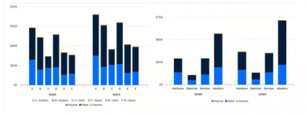 金屬3D打印在航空航天3D打印市場中占據主導地位。它占市場總收入的62%,其中“采用者”創造了一半的金屬收入,估計總額為(wei) 4.92億(yi) 美元。金屬材料(通常是粉末)的銷售額占金屬收入的7.8%,比2022年的估計增長了35.9%。金屬材料占航空航天市場所有材料銷售額的一半多一點,增至7600萬(wan) 美元。