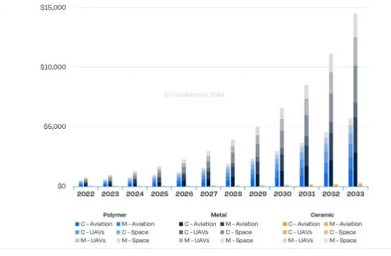 預計到2033年,航空航天AM的銷售額將超過200億(yi) 美元,其中硬件收入預計將達到39億(yi) 美元。