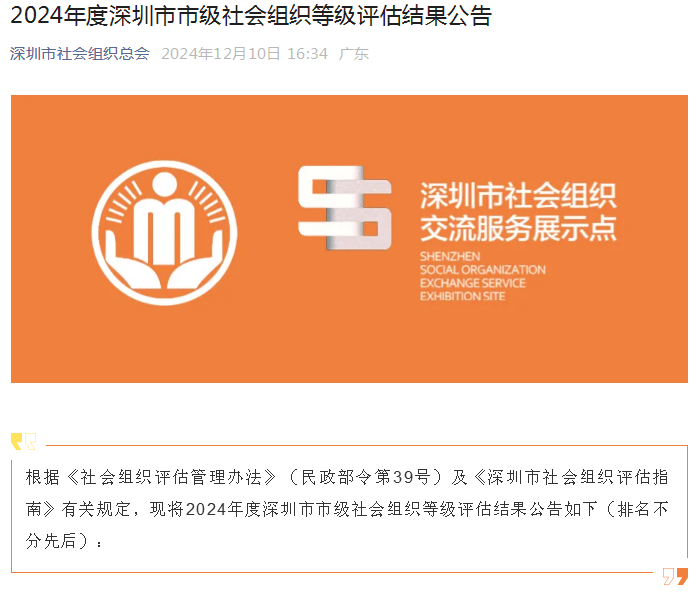 根據《社會(hui) 組織評估管理辦法》(民政部令第39號)及《深圳市社會(hui) 組織評估指南》有關(guan) 規定,現將2024年度深圳市市級社會(hui) 組織等級評估結果公告如下(排名不分先後):