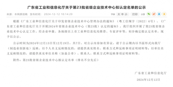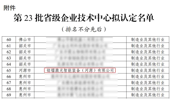 近日,銘鐳激光憑借在激光領域的技術創新和長期研發投入,榮獲廣東(dong) 省第23批省級企業(ye) 技術中心認定。這份榮譽如同冬日裏的一縷暖陽,照亮了銘鐳激光科技創新的征途。