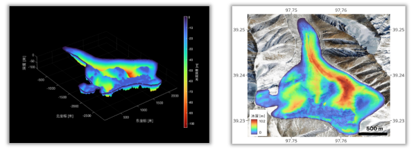 七一冰川三維透視圖 七一冰川厚度分布圖