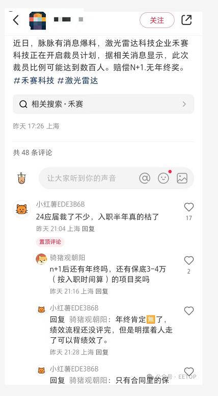 據多家國內(nei) 媒體(ti) 報道,近日,有職場平台傳(chuan) 出消息,激光雷達行業(ye) 巨頭禾賽科技正計劃進行大規模裁員,涉及員工數量達數百人。據內(nei) 部員工透露,裁員賠償(chang) 方案為(wei) N+1,且今年將不再發放年終獎。這一消息迅速在該職場平台上引發熱議。