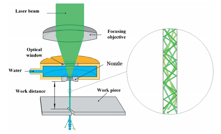 水導激光加工是一種綠色、高效、新型的激光冷加工技術,其技術原理是以高壓微水束作為(wei) “光纖”,通過合理光學設計,將激光耦合至水束中,並通過水束引導激光到加工材料表麵(圖1)。該技術原理研究涉及激光、材料、流體(ti) 、傳(chuan) 熱學等多個(ge) 學科,交叉性強,水與(yu) 激光的耦合技術是該加工方法的關(guan) 鍵技術。