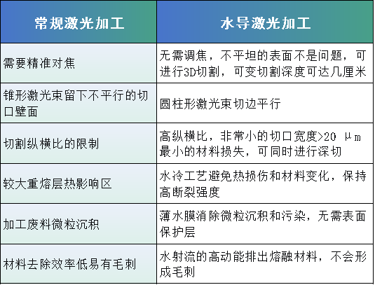 相比於(yu) 傳(chuan) 統激光加工技術而言,水導激光加工具有顯著優(you) 勢。這些優(you) 勢使得水導激光加工在需要高精度切割的應用中,如微電子、金屬及非金屬材料和精密機械製造等領域,具有廣泛的應用前景。