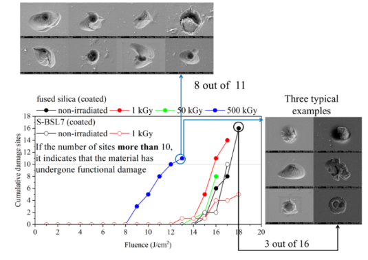 研究團隊采用等效低軌、中軌和高軌劑量的伽馬射線對典型基底材料(熔石英和S-BSL7玻璃)以及激光薄膜元件(532nm反射膜)開展地麵模擬試驗。研究結果顯示,S-BSL7玻璃在低軌對應劑量下即發生暗化,熔石英玻璃隻在高軌對應劑量下出現E’色心,但這兩(liang) 種變化並未明顯影響基底拋光表麵的激光損傷(shang) 閾值;同時發現,鍍製在這兩(liang) 種基底上的高反射膜的光學性能並未受到輻照劑量影響,但高軌對應劑量輻照導致激光薄膜的抗激光損傷(shang) 能力出現明顯下降。研究重點解析了高軌劑量誘導激光薄膜抗激光損傷(shang) 能力下降的影響途徑是薄膜中存在的缺陷,並采用蒙特卡洛模擬分析了高能射線誘導的二次電子在缺陷區域的聚集特征,從(cong) 實驗和理論分析兩(liang) 方麵對結果進行了確認。該研究工作首次闡明了伽馬射線與(yu) 激光共同作用於(yu) 激光薄膜元件的基本物理圖像,確定了作用點和作用機製,為(wei) 空天激光用激光薄膜元件的早期失效篩選提供了方案,對於(yu) 空天激光器的長壽命性能保障具有重要價(jia) 值。