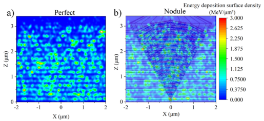 圖2. 伽馬射線對完好結構和缺陷結構能量沉積的蒙特卡洛模擬圖:a)完好薄膜;b)缺陷結構