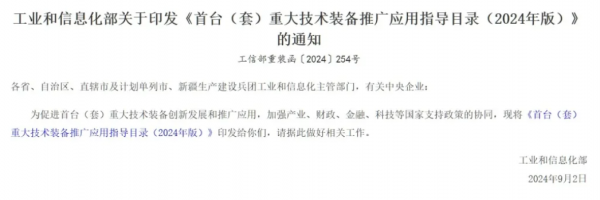 2024年9月9日,工業(ye) 部和信息化部發布了最新的《首台(套)重大技術裝備推廣應用指導目錄(2024年版)》(以下簡稱《目錄》)。