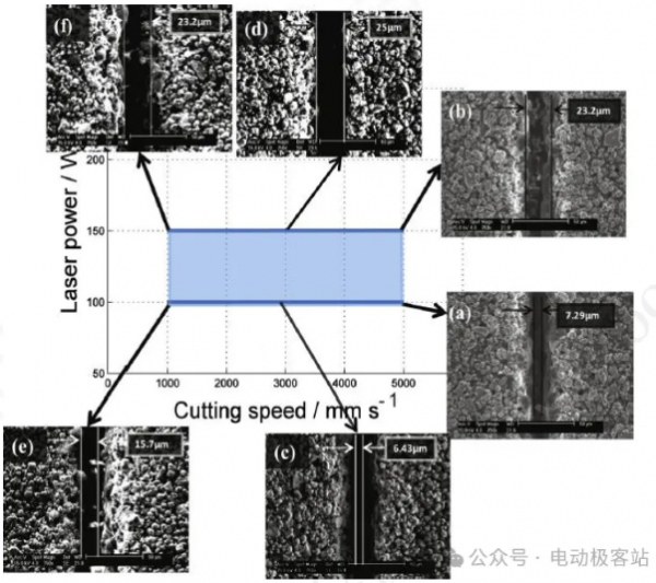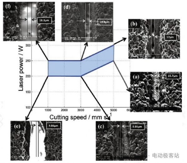 有研究者曾探究過激光能量和切割移動速度這兩(liang) 個(ge) 工藝參數對極片質量的影響。當激光功率太低或者移動速度太快時,極片不能完全切開,而當功率太高或移動速度太低時,激光對材料作用區域變大,切縫尺寸更大。