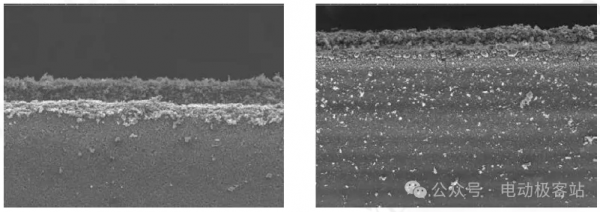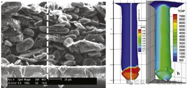 圖5是單麵塗層的負極在激光作用下極片厚度方向的銅成分和溫度分布,當激光作用在石墨層時,由於(yu) 材料的特性,石墨主要發生汽化,當激光侵入到金屬銅箔時,銅箔開始發生熔化,形成熔池。工藝參數不合適時,可能出現問題:(1)切邊塗層脫落,露出金屬箔材,如圖6左圖所示;(2)切邊周圍出現大量切屑異物。這些都會(hui) 導致電池出現性能下降、安全性品質問題,如圖6右圖所示。因此,當采用激光切割時,需要根據活物質材料和金屬箔材的特性,優(you) 化合適的工藝參數,才能既完全切割極片,又形成良好的切邊質量,不產(chan) 生金屬切屑雜質殘留。