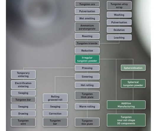 下圖展示了使用鎢礦石或鎢金屬廢料作為(wei) 原材料的線材、棒材和板材生產(chan) 的傳(chuan) 統路線以及較新的AM路線。對於(yu) 鎢而言,傳(chuan) 統的熱熔技術(例如鑄造)幾乎不可能生產(chan) 塊狀鎢金屬,這是因為(wei) ,在現有材料中,沒有足夠耐熱的固體(ti) 材料可以安全且惰性地包裹熔融的鎢,使得通過這種常規方式加工鎢變得極為(wei) 困難。