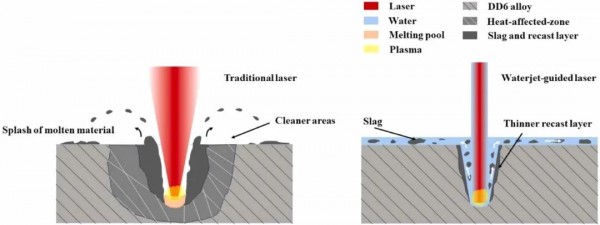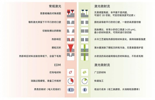 圖2 傳(chuan) 統激光加工與(yu) 水導激光加工特點比對