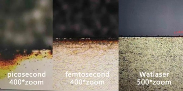圖3 加工不鏽鋼對比:皮秒激光(左)、飛秒激光(中)和水導激光(右)