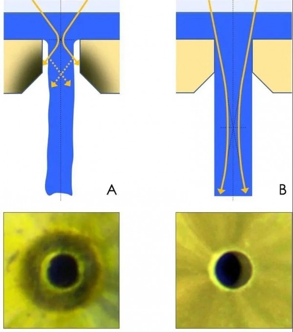圖5 傳(chuan) 統激光打孔(A)與(yu) 水導激光打孔(B)的對比