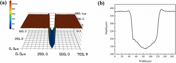 圖7 a)切槽的微觀三維形貌;(b)切槽的橫截麵視圖