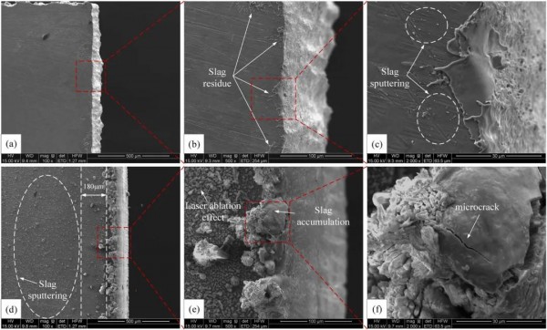 圖9 水導激光和傳(chuan) 統納秒激光開槽後材料上表麵的形貌:(a)、(b)、(c):水導激光;(d)、(e)、(f):傳(chuan) 統納秒激光