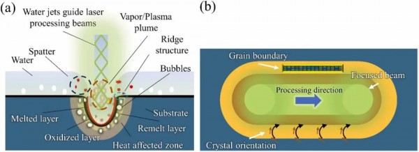 圖17 水導激光加工機理示意圖;(a) 加工界麵響應;(b) 重熔層中的晶體(ti) 取向分布