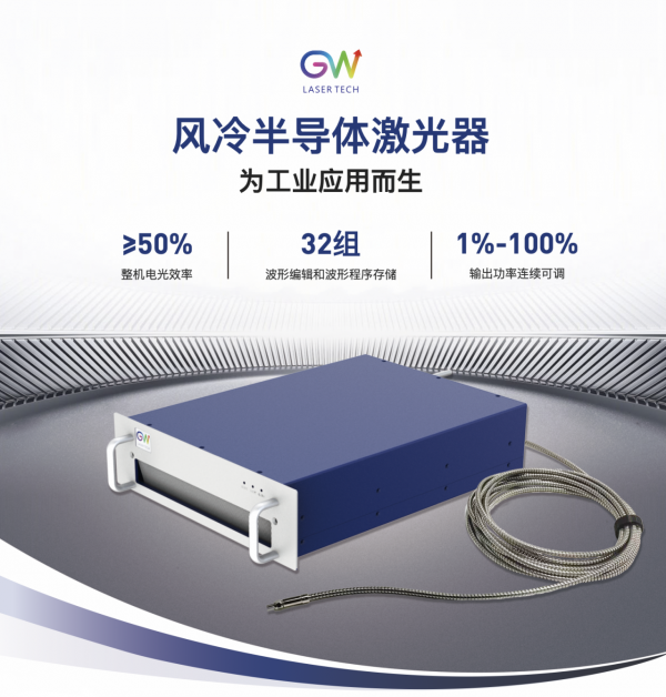 GW光惠激光最新推出的風冷半導體(ti) 激光器,采用先進的風冷技術,無需複雜的水冷係統,,降低使用成本,輕鬆實現長時間穩定運行。同時,支持功率從(cong) 1%到100%調節,靈活適應不同加工需求,從(cong) 精細微加工到高功率切割,一機搞定。支持32組波形編輯與(yu) 存儲(chu) ,自定義(yi) 激光輸出,快速切換任務,滿足多樣化高精度加工需求。