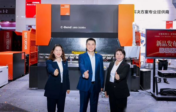 在熱烈的掌聲中,瑞士百超集團中國區及亞(ya) 太區總裁 遊鬆博士、百超(深圳)副 CEO 顏春英和百超(深圳)銷售副總許紅敏共同為(wei) 新品揭幕。當紅色的幕布緩緩落下,新品D-Tube F 激光切管機及C-Bend S 電液伺服折彎機展現在眾(zhong) 人麵前。這兩(liang) 款新品在外觀設計上簡約而不失大氣,線條流暢且極具科技美感;技術層麵更是取得了創新性突破。