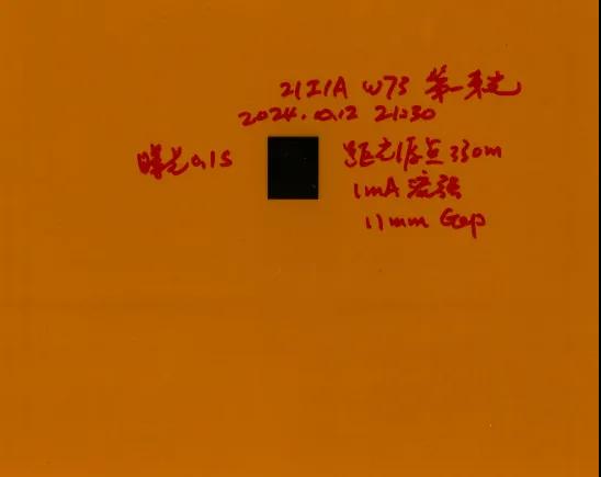 看到第一束光打出的黑斑,現場躁動起來,有人遞給董宇輝一支紅色馬克筆,讓他在膠片上寫(xie) 點東(dong) 西。他拔下筆帽,在黑色光斑周圍寫(xie) 下:“21I1A,W73,第一束光;2024.10.12,21:30;曝光0.1s(秒);距光源點330m(米)……”