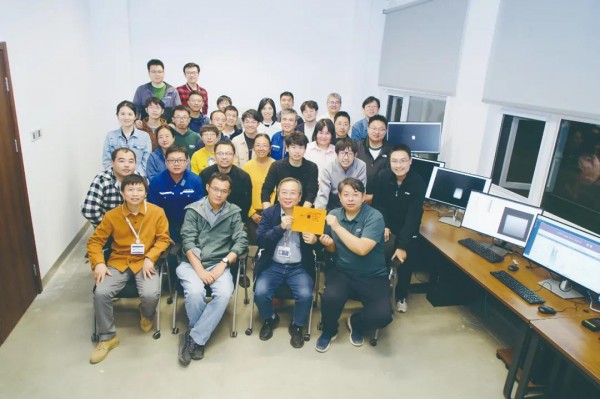 做完記錄後,董宇輝和在場的30多位實驗人員,舉(ju) 起帶黑斑的橙色膠片,拍了張合影。合影裏的橙色膠片和一張張笑臉,成為(wei) 這個(ge) 高能同步輻射光源新裏程碑的標誌。