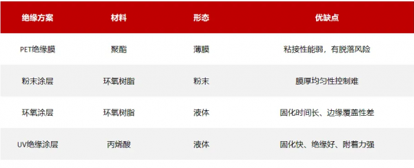 目前,主流的電芯絕緣方案大致分為(wei) 四種,分別是PET絕緣膜、粉末塗層、環氧塗層和UV絕緣塗層。PET膜是薄膜形態,與(yu) 電池殼體(ti) 之間的粘接性能較弱,在複雜使用環境下容易脫落,電池安全性降低。環氧塗層工藝雖然在一定程度上解決(jue) 了PET膜附著力不足的問題,但其固化時間長,影響生產(chan) 效率。粉末噴塗工藝在某些場景下也有應用,但其均勻性難以控製,且存在較高的安全隱患。此外,粉末噴塗對環境也有一定影響,不符合現代製造業(ye) 的環保要求。因此,UV塗裝工藝憑借快速固化、強附著力、高絕緣性等優(you) 勢,正逐漸成為(wei) 電池絕緣塗覆的新趨勢。