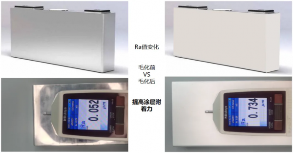 UV塗裝工藝對電池殼表麵粗糙度(Ra值)要求極高,精準控製表麵粗糙度是確保塗層附著力、絕緣性能、耐老化性能及提升UV塗裝效率的關(guan) 鍵。在這一領域,激光技術憑借其卓越的精準控製能力,為(wei) 實現UV塗裝工藝的優(you) 化升級提供了有力支持。