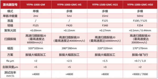 方案優(you) 勢:高功率輸出,聚焦光斑較大,效率高,最大效率可達9000+mm²/s。可全自動化集成,適用範圍廣,滿足不同材質和厚度的電池殼需求。專(zhuan) 為(wei) 電池毛化定製的YFPN-1000-GMC-H50方型光斑激光器,可配合振鏡進行飛行打樣,大幅提高加工效率。