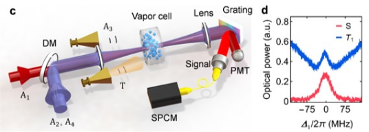 圖1. (a) 太赫茲(zi) —近紅外光子相幹上轉換原理圖;(b) 非簡並六波混頻87Rb 原子係統能級圖;(c) 實驗裝置示意圖;(d) 六波混頻產(chan) 生信號 (紅色) 和泵浦場透射信號 (藍色) 。