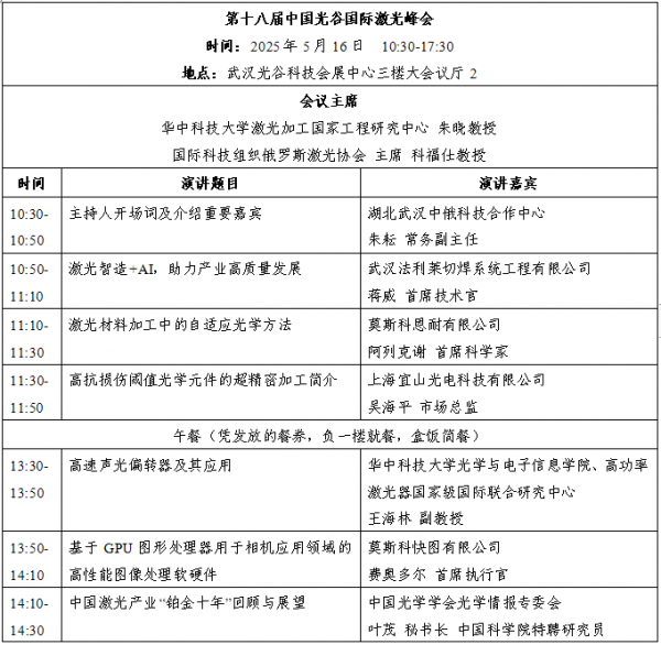 在第二十屆“中國光穀”國際光電子博覽會(hui) (OVC EXPO 2025)框架下,第十八屆中國光穀國際激光峰會(hui) 將於(yu) 2025年5月16日,10:30-17:30,在武漢光穀科技會(hui) 展中心三樓大會(hui) 議廳2舉(ju) 辦。