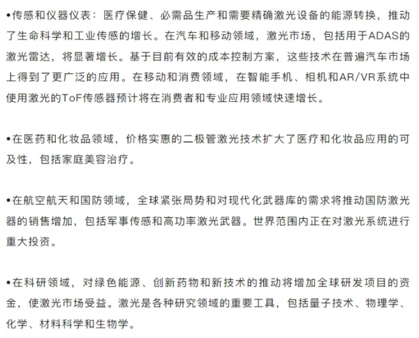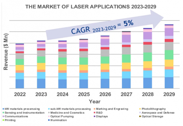 盡管全球整體(ti) 產(chan) 量呈現溫和增長,但激光行業(ye) 仍保持其增長彈性,2023年與(yu) 2022年相比實現了近7%的增長。冠狀病毒疫情後,製造業(ye) 和高科技行業(ye) 在2021年和2022年表現尤其強勁,前十大激光製造商的收入大幅增長了20%以上。然而依賴激光器的關(guan) 鍵行業(ye) 並沒有達到預期表現,因此2024年和2025年的激光市場規劃需要更加謹慎。但我們(men) 相信激光市場將在2023-2029年以5%的複合年增長率持續增長,到2029年全球總產(chan) 值將超過200億(yi) 美元。