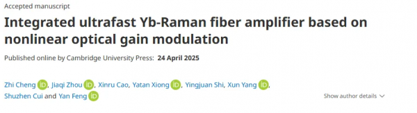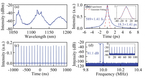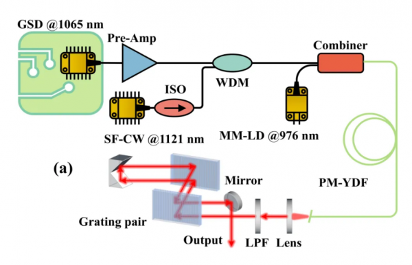 近期,中國科學院上海光學精密機械研究所空天激光技術與(yu) 係統部周佳琦研究員團隊,在超快光纖激光稀土拉曼混合放大研究方麵取得進展。 相關(guan) 成果以“Integrated ultrafast Yb-Raman fiber amplifier based on nonlinear optical gain modulation”為(wei) 題,發表在High Power Laser Science and Engineering上。 在傳(chuan) 統的非線性光學增益調製係統中,泵浦脈衝(chong) 能量放大單元和非線性光學頻率轉換單元是分開的,一方麵需要高功率波分複用器耦合高能泵浦脈衝(chong) 和單頻連續激光種子,另一方麵高功率工作下有源光纖和無源光纖的熔接也會(hui) 對係統長期穩定性構成風險。 圖1 實驗裝置示意圖 針對這些問題,研究團隊開發了一種新型的超快光纖激光稀土拉曼混合放大器,利用摻鐿光纖同時提供稀土增益和拉曼增益,可以產(chan) 生單脈衝(chong) 能量更高的拉曼脈衝(chong) (圖1)。在實驗中,一階拉曼脈衝(chong) 的單脈衝(chong) 能量可被放大至~1 μJ,脈寬可壓縮至589 fs,最大拉曼轉換效率可達69.9 %(圖2),並且通過數值模擬探究了產(chan) 生10 μJ量級拉曼脈衝(chong) 的可能。該研究提供了一種產(chan) 生微焦量級拉曼脈衝(chong) 的方法,在非線性光學成像和微機械加工等領域具有潛在的應用價(jia) 值。 圖2拉曼脈衝(chong) 輸出特性 (a)光譜;(b)自相關(guan) 曲線;(c)脈衝(chong) 序列;(d)RF譜