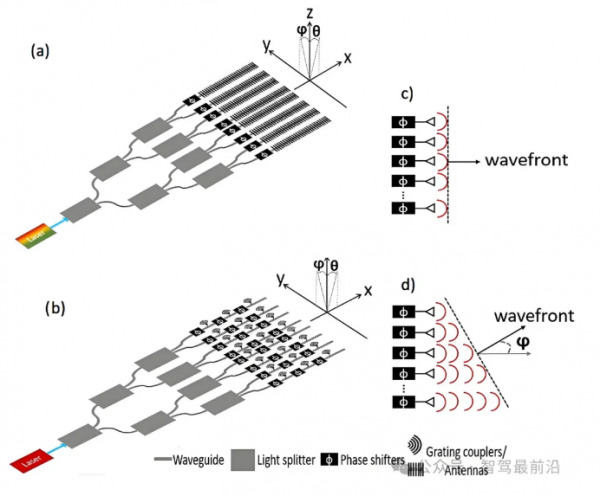 圖(c):展示了一維光學相控陣中波前(wavefront)的情況。多個(ge) 發射單元(標注 φ 的三角形)發出的光形成平麵波前,通過控製各單元相位可控製波前方向。