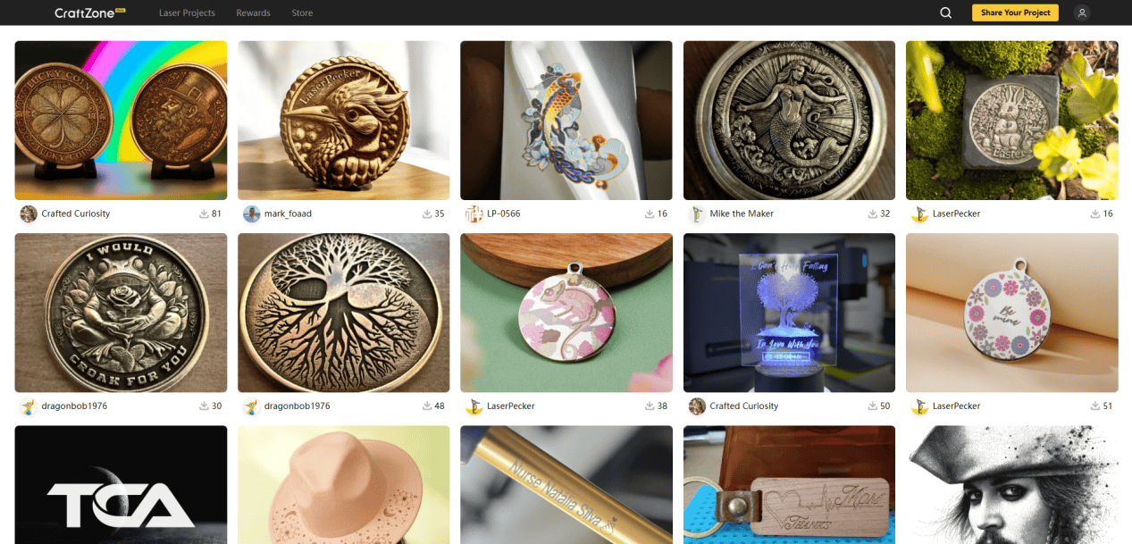 然而,LaserPecker對其獨立站的定位遠不止於(yu) 一個(ge) 簡單的銷售平台。在這裏,"探索"板塊匯聚了豐(feng) 富的激光雕刻教程和商業(ye) 案例;"畫廊"展示著各型號產(chan) 品的雕刻效果和用戶創意作品;而最具活力的"工藝區"則完全由用戶內(nei) 容構成,創作者可以分享參數設置、操作指南,甚至提供源文件下載。