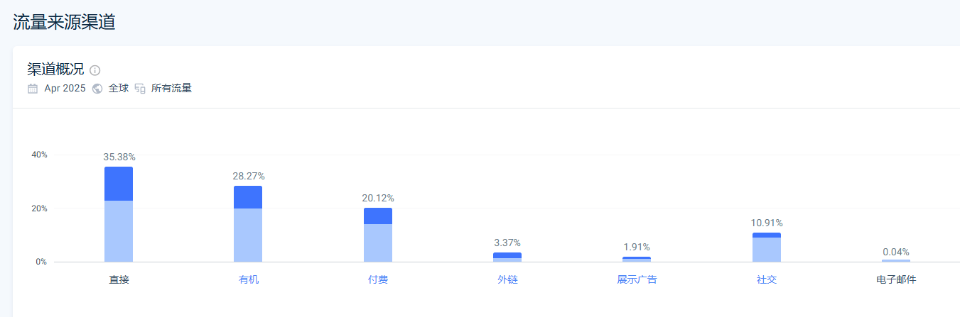 這個(ge) 策略成效顯著,Similarweb數據顯示,2025年4月其獨立站月訪問量達19.2萬(wan) ,其中直接訪問和有機搜索占比過半,展現出強大的品牌號召力。社媒引流占比約10.91%,印證了其多渠道布局的成功。