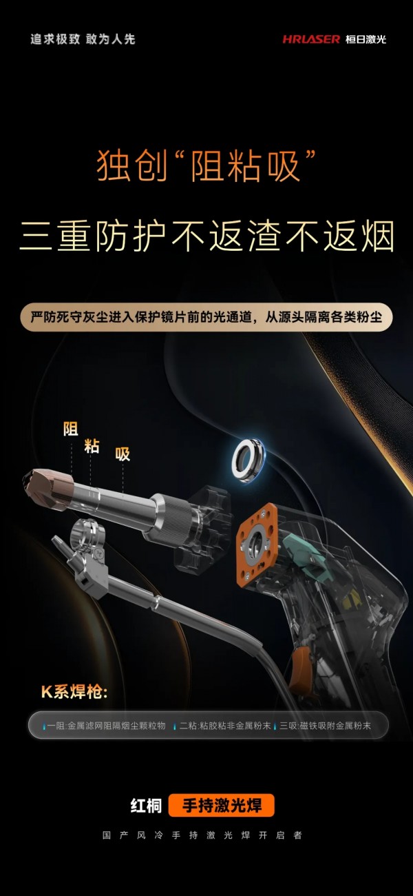 在一定程度上,焊槍技術體(ti) 現了除主機和送絲(si) 機技術外,手持激光焊接設備企業(ye) 技術高低程度,也決(jue) 定了手持激光焊接未來發展的速度。桓日激光K係列焊槍在“疏”、“堵”、“銅嘴”三方麵同時著力,希望以此解決(jue) 槍頭飛濺和粉塵問題。