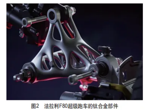 (3)汽車製造:法拉利F1賽車的鈦合金部件使用激光增材製造技術製造,提高了零部件的耐熱性和強度,助力賽車優(you) 化空氣動力學設計。2024年10月,意大利豪華跑車品牌法拉利正式發布了全新F80超級跑車,這款車型不僅(jin) 在動力、設計和技術方麵實現了顯著提升,更是在製造過程中采用了增材製造技術,標誌著汽車製造業(ye) 的一次重大飛躍。F80超級跑車首次采用增材製造技術生產(chan) 了主動懸架係統的上叉臂。傳(chuan) 統的上叉臂設計複雜且對重量極為(wei) 敏感,而增材製造技術則能提供更高的精度和靈活性,如圖2所示。