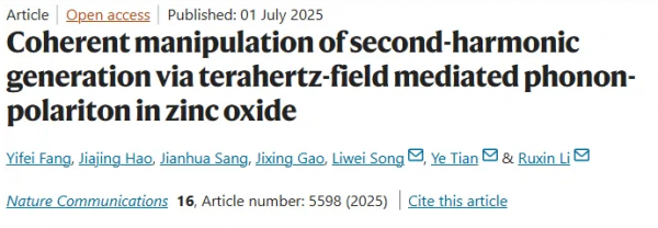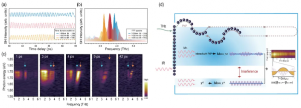 該成果以Coherent Manipulation of Second-Harmonic Generation via Terahertz-Field Mediated Phonon-Polariton in Zinc Oxide為(wei) 題在線發表於(yu) Nature Communications。 高速信號調製技術是光通信、數據中心、量子計算等前沿領域的核心支撐。近年來,矽基和铌酸鋰基兩(liang) 大技術路線在材料集成、工藝突破與(yu) 應用場景擴展上均取得顯著進展。傳(chuan) 統的矽基電光調製技術基於(yu) 自由載流子等離子色散(FCPD)效應或直流Kerr效應,通過施加電壓調製光的相位或強度。這種方式受限於(yu) 電子驅動頻率、RC延遲、電極設計等因素,調製帶寬難以突破百GHz量級。铌酸鋰基電光調製技術基於(yu) 線性電光效應(Pockels效應),通過外加電場改變晶體(ti) 折射率,進而調控馬赫-曾德爾(MZ)幹涉儀(yi) 兩(liang) 臂間的相位差,實現高速、高線性度的光信號調製。目前已實現數百GHz的信號調製,但受限於(yu) 電極微波與(yu) 光波速度失配等問題,達到THz頻率的高速調製仍麵臨(lin) 挑戰。 近年來,團隊在科技部重點研發專(zhuan) 項“超快強激光泵浦強太赫茲(zi) 源驅動材料與(yu) 器件非平衡態研究”支持下,在“羲和”等強激光大科學裝置發展了強場太赫茲(zi) 調控平台與(yu) 技術:實現了基於(yu) 铌酸鋰晶體(ti) 的最強THz脈衝(chong) 源能量紀錄13.9 mJ [Advanced Materials, 35(23): 2208947 (2023)];發展了國際首個(ge) 超越MeV的太赫茲(zi) 波導電子槍,在指尖尺寸(長度5mm)距離實現最高1.1 MeV的電子能量增益 [Nature Photonics 17, 957–963 (2023)]。團隊針對調控機理及器件研發等目標展開攻關(guan) ,係統研究了寬禁帶半導體(ti) ZnO中聲子極化激元(PhP)的產(chan) 生機製及其調製原理。 PhP是一類由紅外活性光學聲子與(yu) 電磁波強耦合而形成的準粒子,具有方向性強、電場限域能力高等特性,廣泛存在於(yu) 極性晶體(ti) 中,特別活躍於(yu) THz頻段。在自主搭建的超快THz泵浦-探測係統上,通過調控THz場強、偏振、紅外光波長等,成功激發出3~4 THz範圍內(nei) 的PhP。該PhP以THz頻率調控ZnO晶體(ti) 內(nei) 極化反轉,進而激發光波的SHG過程,且產(chan) 生的光學SHG相位以THz頻率變化。這一相位高速調製的光信號與(yu) 晶體(ti) 內(nei) 本征SHG幹涉,可實現光信號強度的THz頻率調製。這種通過調控相位實現信號強度高速調製的機製,可類比於(yu) 铌酸鋰基光信號調製原理,而調製頻率提高了一個(ge) 量級。得益於(yu) ZnO晶體(ti) 中PhP的低損耗、高反射特性,PhP在1mm晶體(ti) 內(nei) 完成九次反射,對SHG信號實現了持續約90ps,消光比約18 dB,頻率3~4THz的高速調製。 這種基於(yu) THz-PhP 驅動的光學SHG產(chan) 生與(yu) 調製過程,構建了一種全新的時頻聯合控製平台。相比傳(chuan) 統非線性調製器,PhP 係統具備兩(liang) 大關(guan) 鍵優(you) 勢:一是工作頻率覆蓋 THz 至中紅外的寬廣頻段,滿足高帶寬應用需求;二是其周期性傳(chuan) 播結構天然適配相幹控製,能夠將 THz 振蕩特征嵌入通信波段光學響應中,適用於(yu) 構建頻率轉換器件。研究構建了“光聲準粒子機製——光脈衝(chong) 調製器”,對THz超高重頻激光的研發具有重要意義(yi) ,並有望作為(wei) THz頻率調製器等核心部件應用於(yu) 超高速光信息通訊領域。 圖 (a)-(c)展示利用紅外探測光研究THz-PhP激發和傳(chuan) 輸動力學。圖(d)展示THz輔助聲子激發及THz-PhP演化實驗結果與(yu) 相位匹配機理