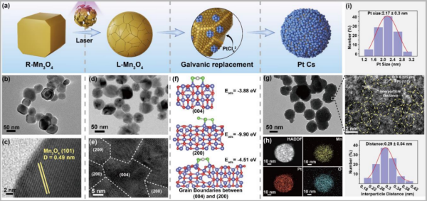 為(wei) 增強Pt納米顆粒的光收集能力,研究人員設計了Cs結構,利用金屬顆粒間的光子散射效應,提高Pt納米顆粒從(cong) 可見光到近紅外波段的光吸收效率。同時,將Pt納米顆粒嵌入金屬氧化物介電基質中,促進吸收介電表麵散射的光子。研究發現,Pt離子與(yu) Mn3O4(四氧化三錳)表麵發生電化學置換反應,可形成多孔的 Pt/Mn3O4納米複合材料,其中Mn3O4作為(wei) 犧牲劑,形成了負載超小Pt納米顆粒的多孔骨架。