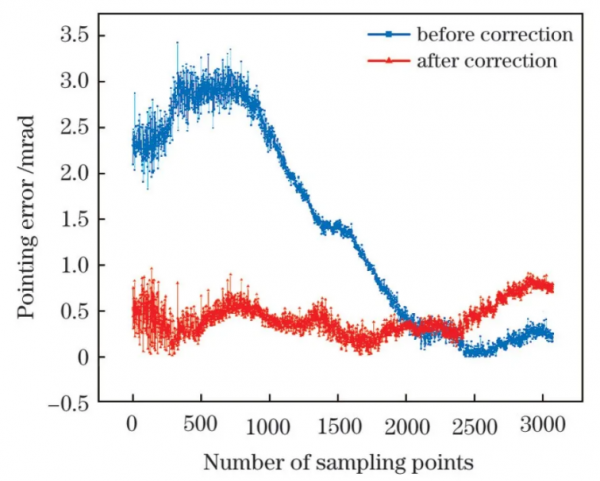 中國科學院上海光學精密機械研究所侯霞、魯紹文團隊針對星載激光通信中快速建鏈的應用需求,提出了一種基於(yu) 參數尋優(you) 的激光通信終端指向在軌快速標校方案。該方案綜合應用複雜的坐標係轉換和誤差修正矩陣,實現了對理論指向矢量的高精度修正,采用了斐波那契查找算法結合最小二乘法的尋優(you) 策略,提高了標校過程的收斂速度和精度,實現了對激光通信終端光軸的快速、精確標校。修正後的指向誤差結果如圖1所示,最小0.02 mrad,最大0.81 mrad,平均誤差為(wei) 0.42 mrad。
