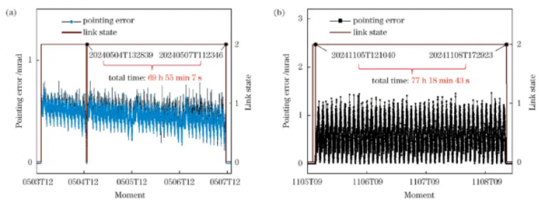 課題組在衛星上進行了多次在軌驗證,實現了同軌道麵上衛星之間最小指向誤差為(wei) 0.10 mrad,最大0.95 mrad,平均誤差為(wei) 0.46 mrad,如圖2(a)所示;異軌道麵衛星之間最小指向誤差為(wei) 0.01 mrad,最大1.46 mrad,平均誤差為(wei) 0.51 mrad,如圖2(b)所示,在軌驗證結果與(yu) 最後一次指向偏差修正結果吻合。階段性在軌驗證實驗表明,對激光終端指向偏差修正後,指向殘差約為(wei) 0.5 mrad,平均捕獲時間從(cong) 最初大於(yu) 8 min減小到小於(yu) 15 s,最大不超過30 s,與(yu) 國內(nei) 其它在軌建鏈驗證試驗(θFOU<1.5 mrad)相比具有顯著提升。