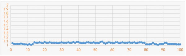 同時,由於(yu) 3D打印設備多為(wei) 多光源作業(ye) ,因此多台光源的光束質量一致性又尤為(wei) 重要。通過從(cong) 產(chan) 線隨機拉取的百台3D打印專(zhuan) 用光源出廠測試數據顯示,該係列光源全部穩定在1.0至1.1之間,一致性極強。