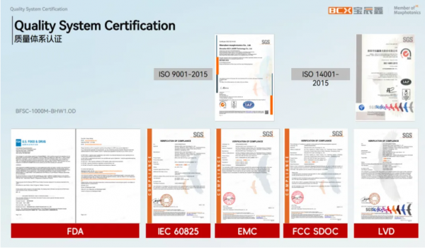 在產(chan) 品認證方麵,寶辰鑫BFSC 300-1000 CW 連續係列 (1U)產(chan) 品完成全球CE、FDA認證,基本覆蓋全球客戶的需求。寶辰鑫將繼續堅守產(chan) 品品質管理,嚴(yan) 格把關(guan) 產(chan) 品質量,讓中國造在世界贏得優(you) 良口碑。