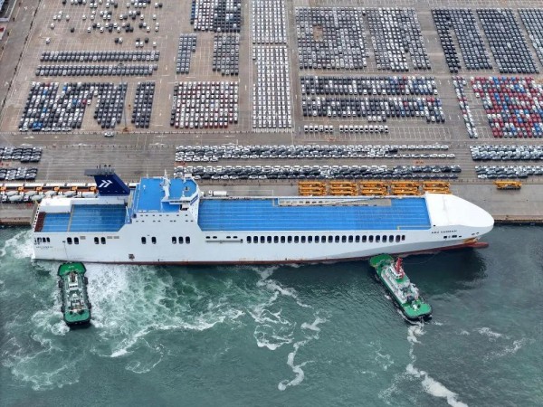 6月29日,汽車運輸船停靠山東(dong) 港口煙台港,準備裝運出口汽車(無人機照片)。新華社發(唐克 攝)