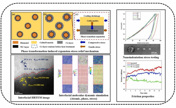 1. 相變誘導膨脹的主動應力調控機製。首次提出基於(yu) HCP→FCC相變驅動體(ti) 積膨脹(2.89%)的主動應力補償(chang) 策略。通過在金剛石表麵構建W/Co雙層功能塗層,利用鈷層在 LPBF 熱循環中的固態相變產(chan) 生可控膨脹,直接抵消因CTE失配導致的熱收縮殘餘(yu) 應力,從(cong) 根源上突破傳(chuan) 統熱應變補償(chang) 的被動局限。
