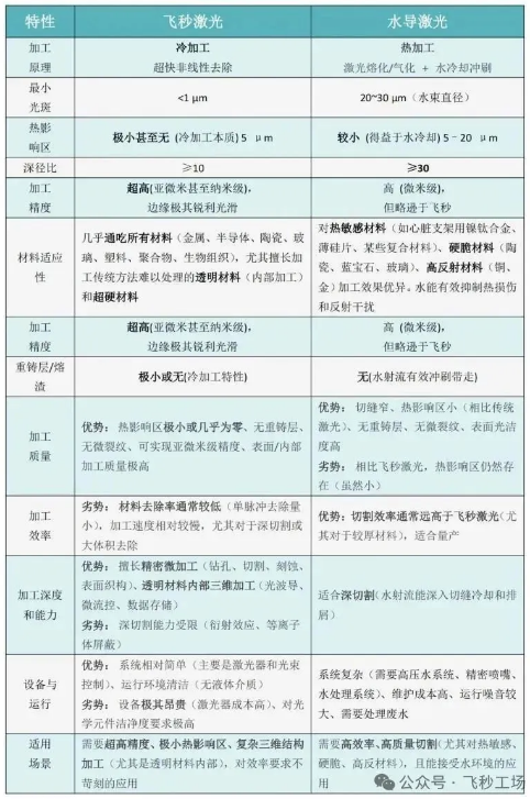 注:水導激光技術邊界: 水束直徑直接限製光斑尺寸,Synova通過超精細噴嘴技術將水束穩定控製在20 μm(約頭發絲(si) 的1/4),為(wei) 行業(ye) 最高水平。 二、性能大PK:各顯神通 注:以上對比內(nei) 容取自網絡素材 三、應用舞台:誰主沉浮? 水導激光的主場: 需要大深度、無錐度、高速度切割的場合: 如半導體(ti) 晶圓劃片與(yu) 切割(尤其厚矽片)、陶瓷基板切割、硬質合金刀具加工、航空航天複合材料(如碳纖維增強複合材料CFRP)切割、厚金屬箔切割、醫療器械(如骨鋸片)製造。 加工易產(chan) 生熔渣/再鑄層的材料: 水射流能有效解決(jue) 這個(ge) 問題。 對熱影響有一定容忍度,但要求高效率和較大深徑比的場景。 飛秒激光的主場: 要求無熱影響且超精密、超光滑表麵的場合: 如醫療支架雕刻、心髒起搏器電極加工、眼科手術(如LASIK角膜瓣製作)、精密醫療器械製造等。 透明材料加工: 如玻璃內(nei) 部打標/雕刻、藍寶石蓋板切割/鑽孔、光學元件微加工。 脆性/熱敏材料加工: 如太陽能電池劃線、微電子封裝、脆性半導體(ti) 材料微結構。 表麵微納結構製備: 如功能性表麵(疏水/親(qin) 水)、光學衍射元件、生物芯片微通道。 需要三維精細加工的場合: 如光子晶體(ti) 、微流控芯片。 總結: 飛秒激光是超快脈衝(chong) 驅動的非熱/極小熱影響加工,核心優(you) 勢在於(yu) 超高精度、極小/無熱影響區,能加工幾乎所有材料(尤其透明材料內(nei) 部),實現複雜三維微結構。國內(nei) 外差距在縮小(尤其在應用研究和中低端設備),但在高端工業(ye) 級激光器、核心器件和高端裝備上仍有差距。 水導激光是水射流引導的熱加工,核心優(you) 勢在於(yu) 高質量、高效率地切割熱敏感、硬脆、高反射材料(如醫療支架、藍寶石、矽片、銅),尤其擅長深切割。但國內(nei) 外技術差距較大,核心技術和高端市場被國外(尤其是Synova)主導。 水導激光在特定材料的量產(chan) 型高質量切割上不可替代;飛秒激光在超精密、無熱損傷(shang) 、複雜三維微加工領域是王者。兩(liang) 者並非直接競爭(zheng) 關(guan) 係,甚至可能出現結合兩(liang) 者優(you) 勢的複合加工技術。兩(liang) 種工藝路線可根據材料特性、加工要求(精度、熱影響、效率、深度)和成本預算進行選擇。