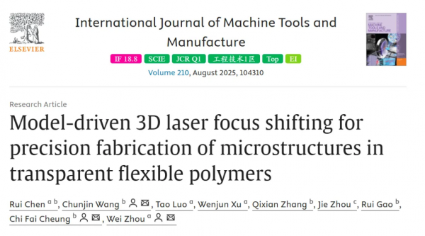 近日,廈門大學薩本棟微米納米科學技術研究院周偉(wei) 教授團隊與(yu) 香港理工大學超精密加工技術全國重點實驗室Chi Fai Cheung(張誌輝)教授、王春錦助理教授合作,在透明聚合物材料高精度三維微結構激光加工技術方麵取得重要突破。團隊提出並實證驗證了一種“模型驅動三維動態聚焦激光加工”(3D-DFL)新工藝,通過實時調控激光焦點,實現複雜微結構的高保真、高一致性製造。研究成果以題為(wei) “Model-driven 3D laser focus shifting for precision fabrication of microstructures in transparent flexible polymers”發表在機械製造領域國際頂級期刊International Journal of Machine Tools and Manufacture。